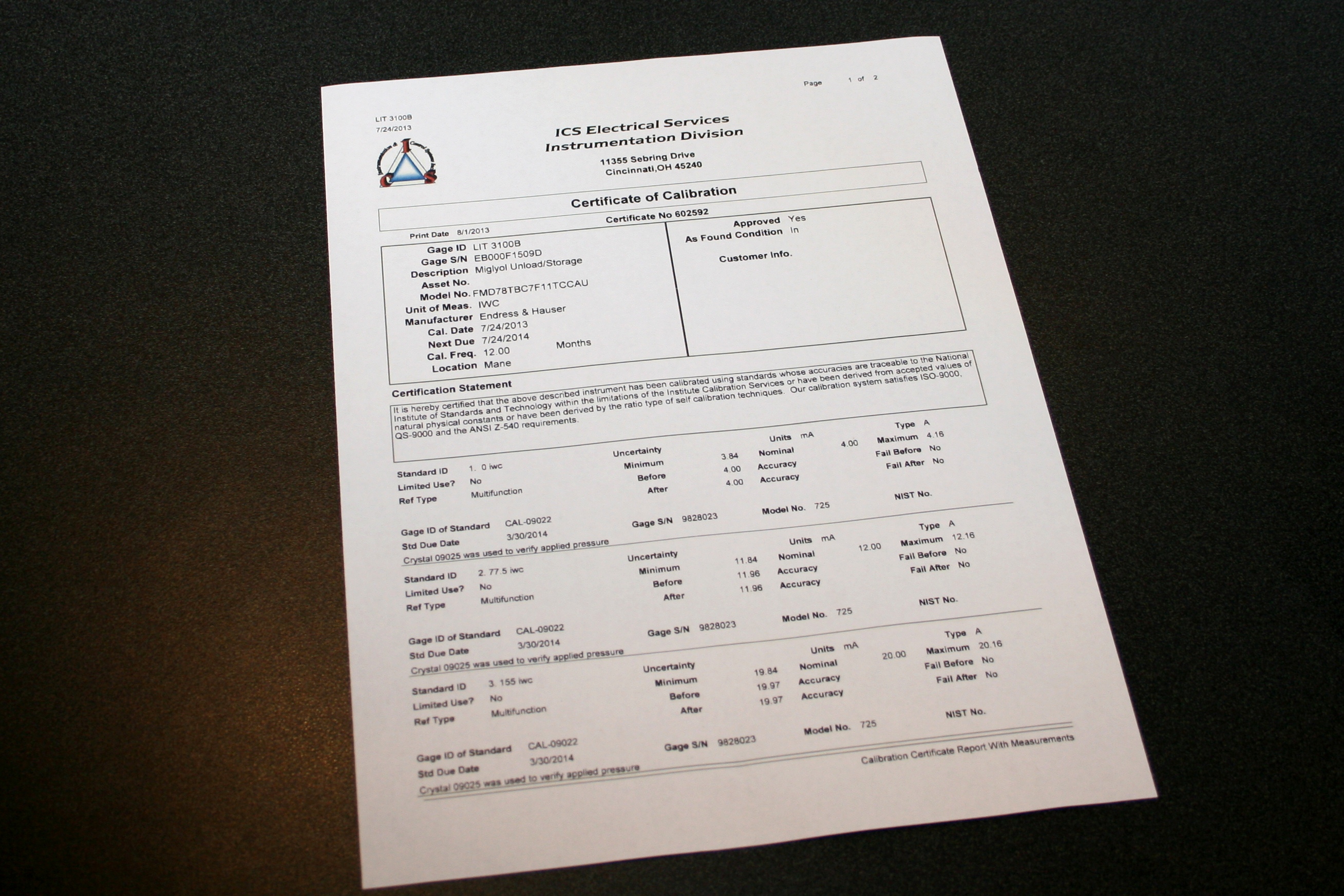 ICS owns and maintains all necessary calibration equipment, including the necessary field programming devices such as Hart and Fieldbus.  All calibrations are documented on an NIST Traceable Certificate of Calibration.